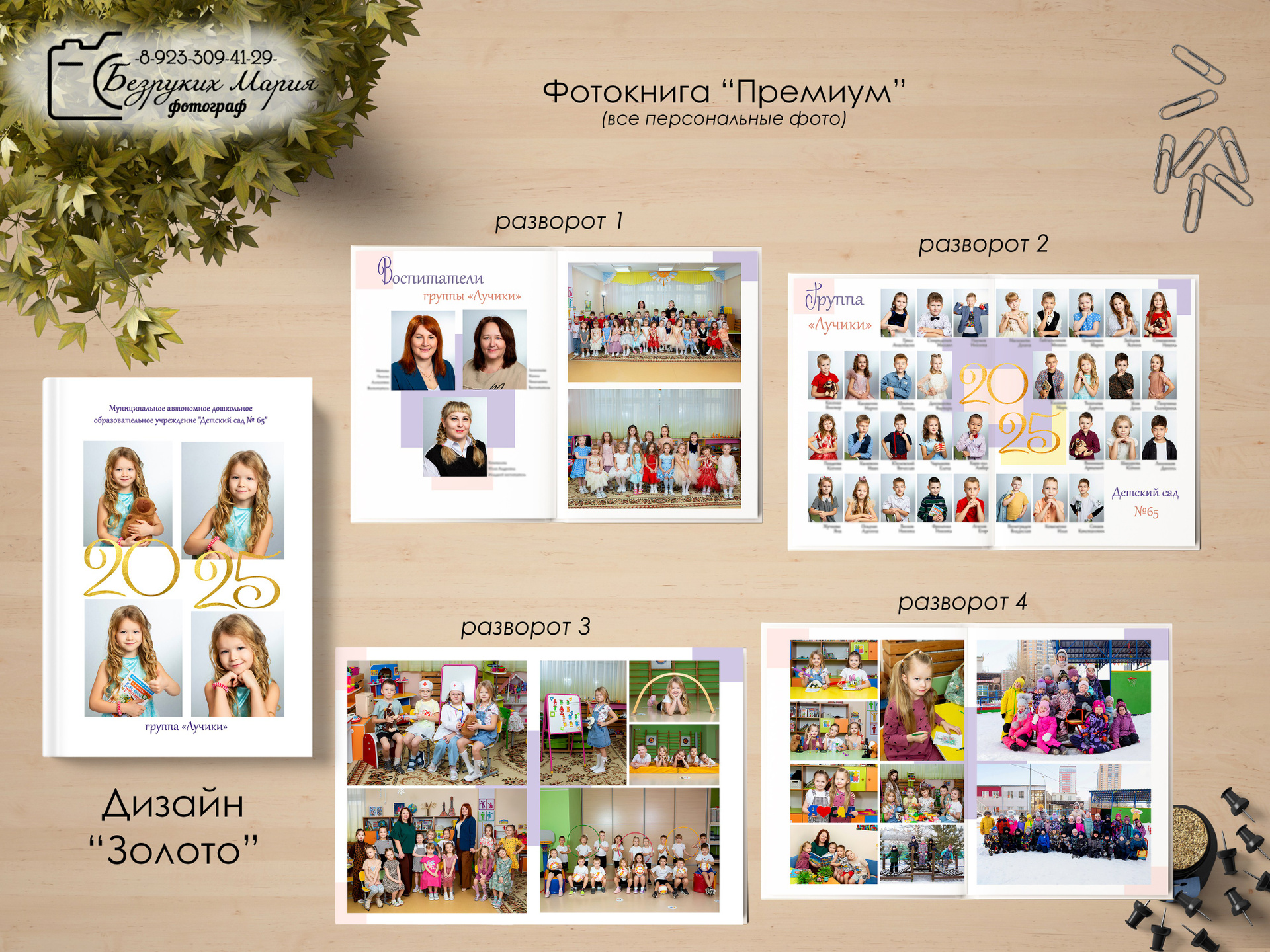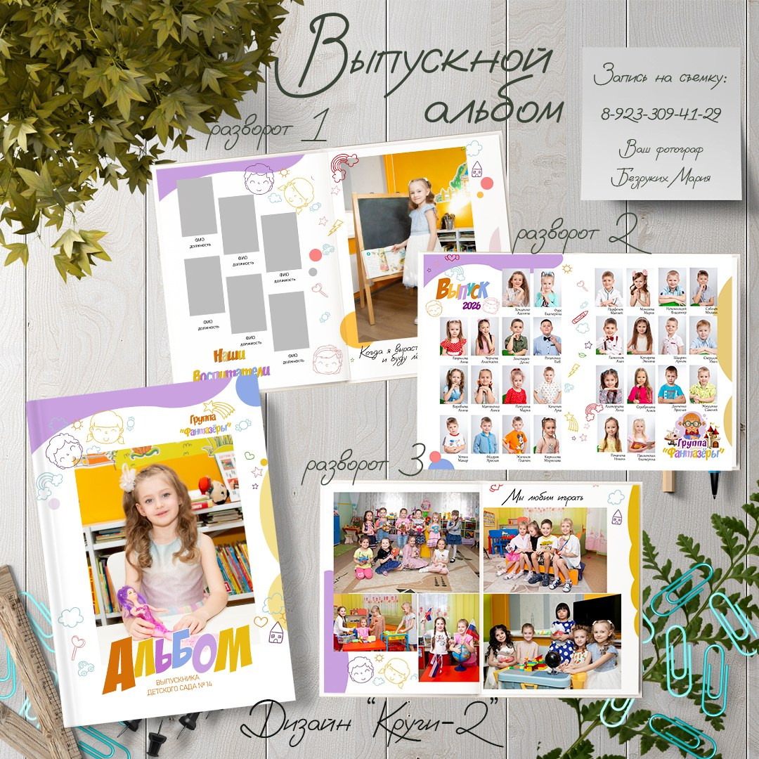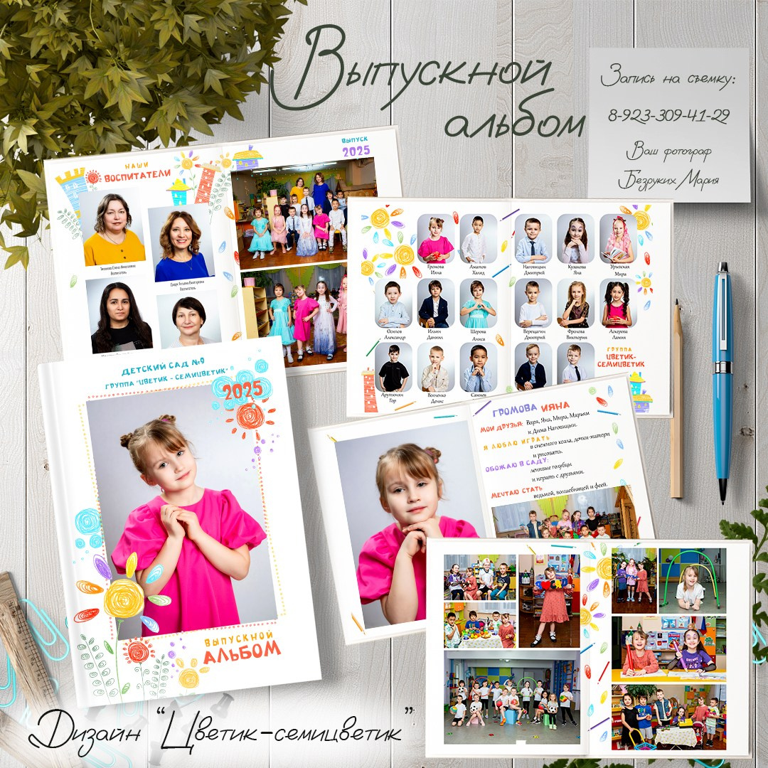 - 1 разворот — портрет ребенка (или общее фото группы) + фотографии воспитателей